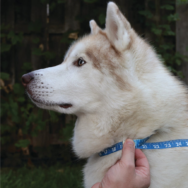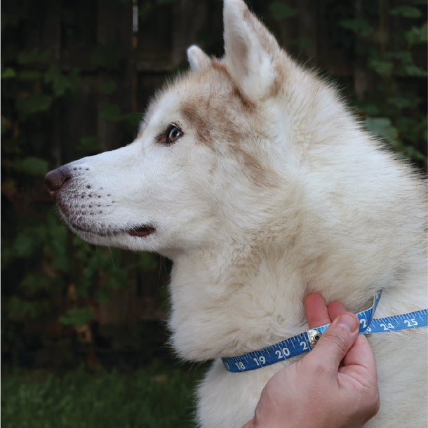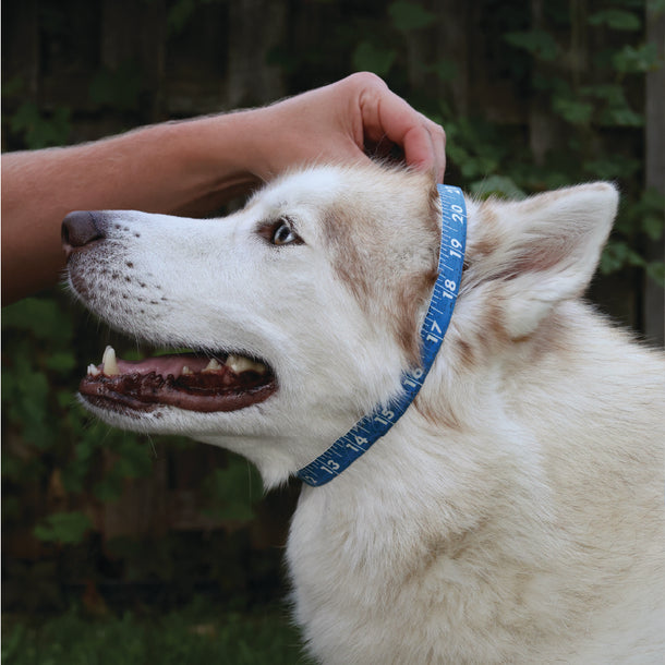 Use a soft tape measure, wrap around the dog’s neck. Verify that the measuring tape is tight enough that it cannot slide off the dog’s head but is not choking the dog. For larger dogs we recommend leaving approximately enough space for two fingers to fit snugly underneath. For smaller dogs we recommend leaving approximately enough space for one finger to fit snugly underneath.